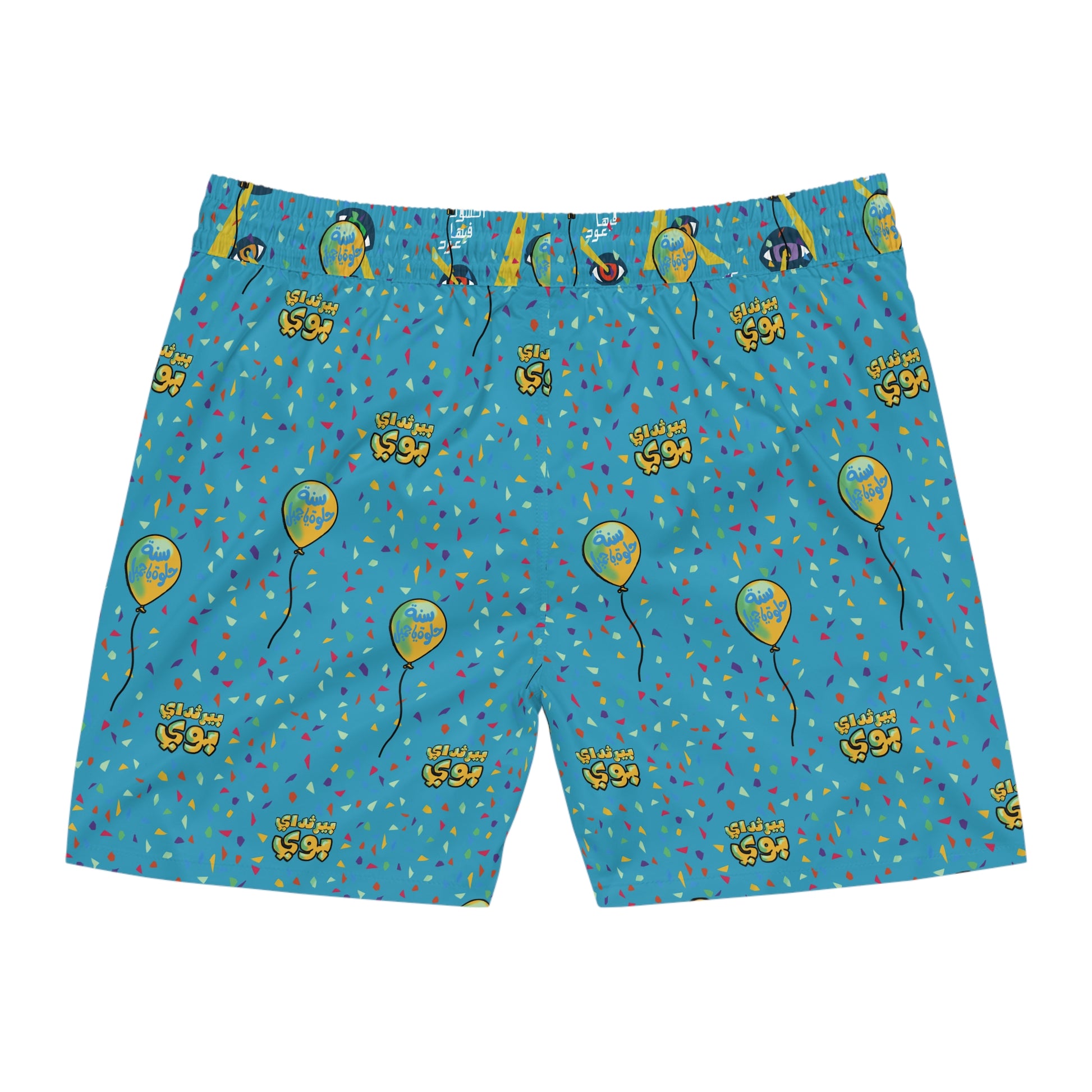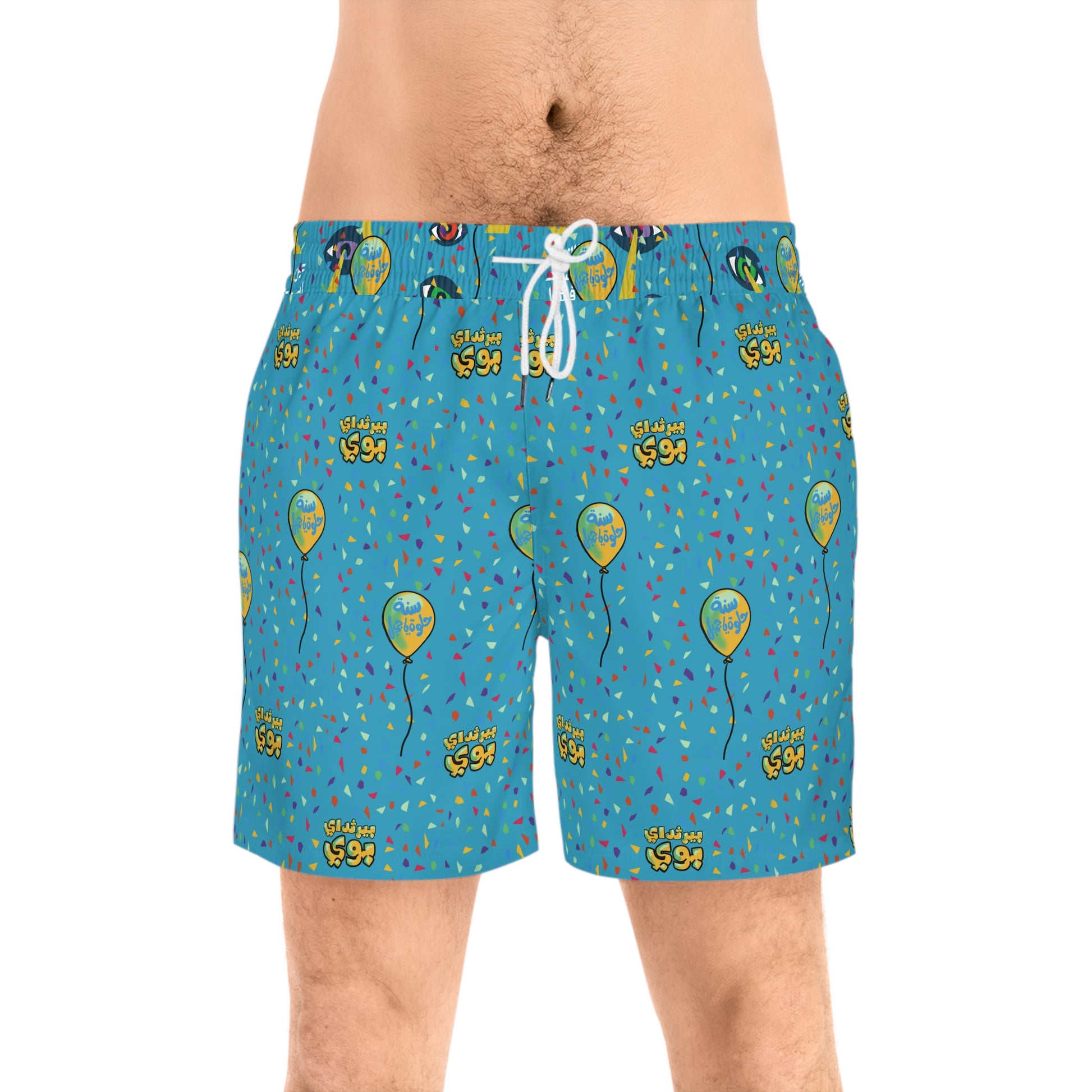 Introducing our vibrant Men's Mid-Length Swim Shorts, designed not just for the beach but for any adventure under the sun. With a playful print featuring confetti and balloons, what better way to celebrate?